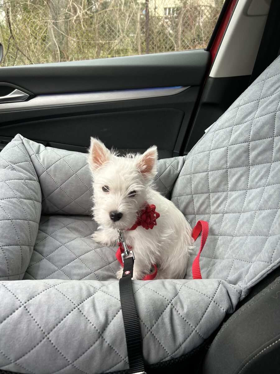 Fotelik jest rewelacyjny. Bardzo ładny i bardzo dobrze wykonany. Fotelik mojego psiaka jest dopasowany już do rozmiarów dorosłego psa, a na razie jeździ w nim 2,5 miesięczny West i też się super spisuje. Na zdjęciu w wydaniu świątecznym 🙂