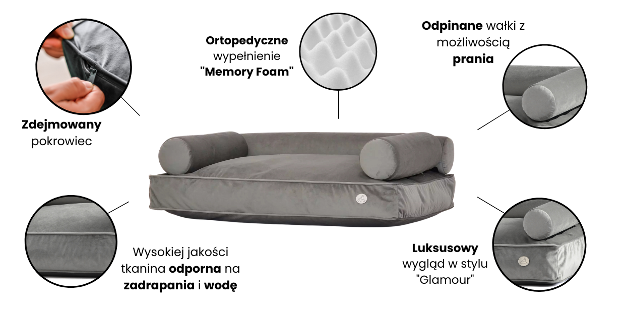 Wyjątkowe legowisko ortopedyczne dla każdego dużego psa, które swoim wyglądem przypomina ekskluzywną kanapę. Niepowtarzalny wygląd i trzy odpinane okrągłe wałki w eleganckim stylu. Stworzone z myślą o psiakach i ich właścicielach. Budowa posłania ułatwia pranie i zachowanie legowiska w czystości, a nieodkształcające się i elastyczne wypełnienie zapewni Twojemu pupilowi komfort i wygodę.
