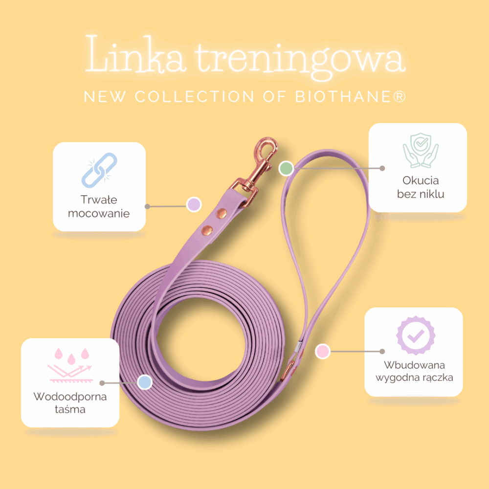 Materiał BioThane to syntetyczne tworzywo, które imituje naturalną skórę, oferując wyjątkową trwałość i łatwość czyszczenia. Jest wodoodporny i nie blaknie na słońcu, co sprawia, że możesz śmiało korzystać z linki treningowej w każdych warunkach. Dodatkowo, linka treningowa jest lekka i poręczna, co ułatwia spacery i trening. Nasze linki posiadają fabryczne uchwyty, aby łatwiej było Ci zapanować nad psem podczas spaceru – nie musisz za nie dopłacać oddzielnie.